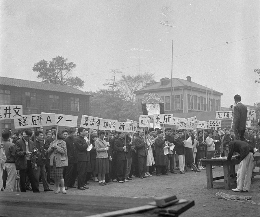 創立25年(1938年)頃の1号館と町屋の間の道を練り歩く
